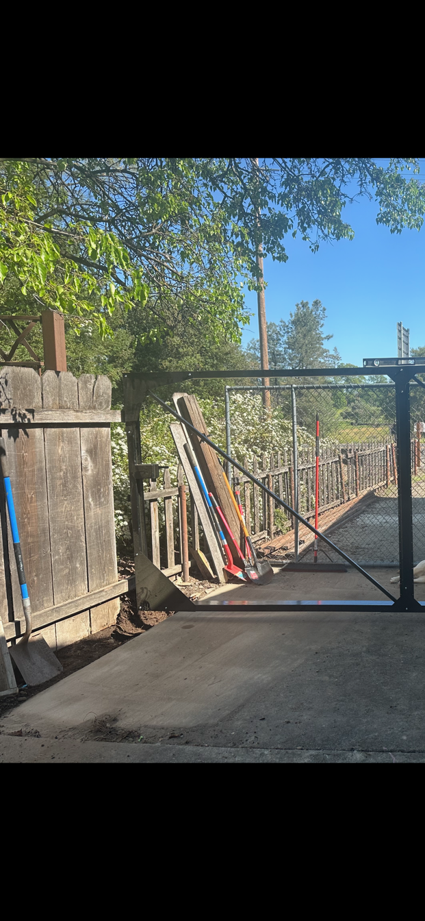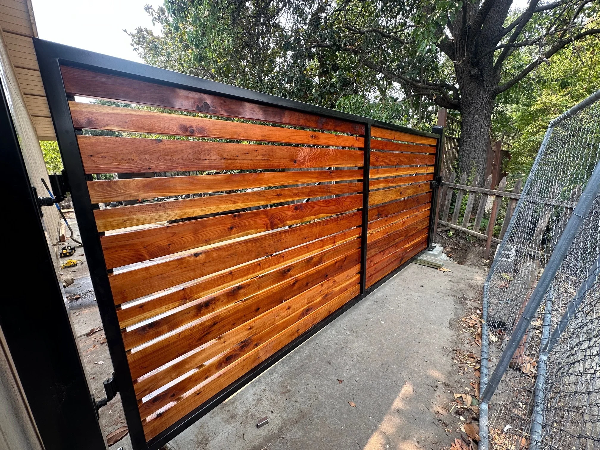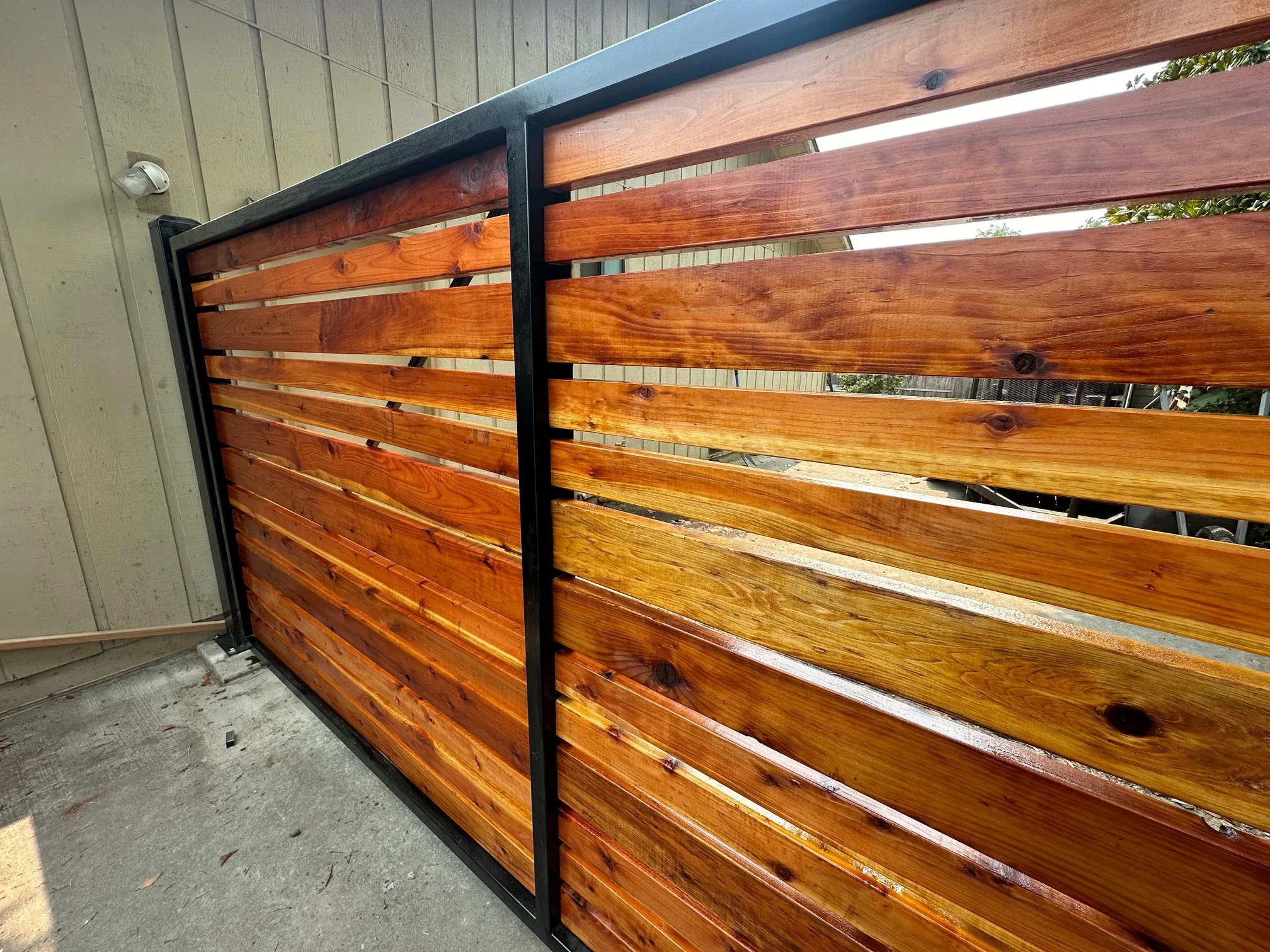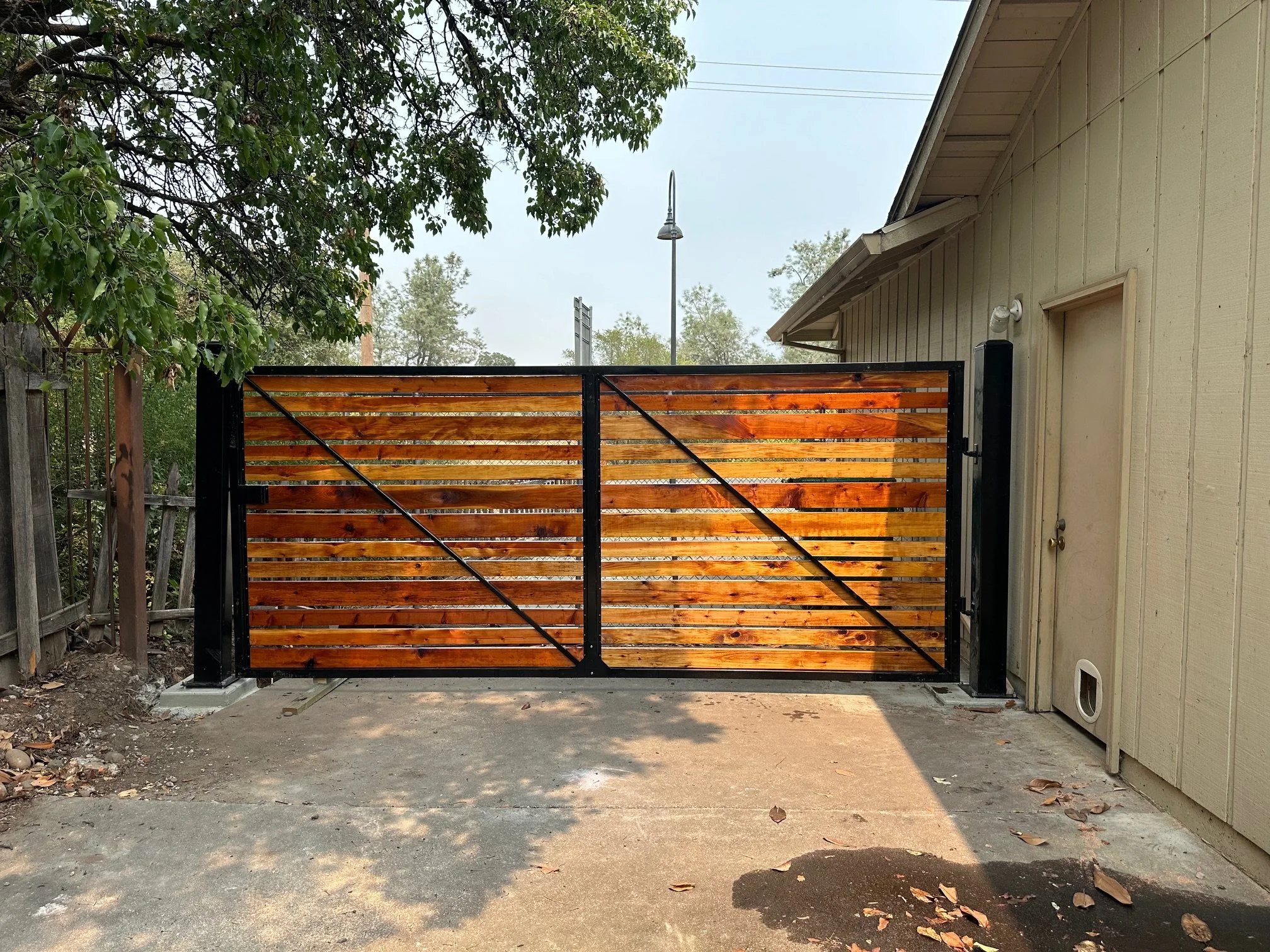 It all begins with an idea. We were asked to create a custom gate to match the existing fence. On this build I partnered with the owner to provide the metal work while they created their own wood inserts. big gates put a lot of pressure on the hinge post so we used large steel posts, lots of concrete and a spring loaded support wheel to handle the slope of the driveway. She’s a beauty!